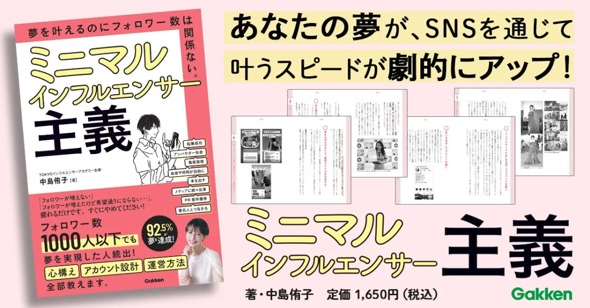 人気インフルエンサー養成学校、TOKYOインフルエンサーアカデミーの代表、中島侑子氏が新著『ミニマルインフルエンサー主義夢を叶えるのにフォロワー数は関係ない。』を2025年8月25日に発表します。この本は、フォロワー数が1,000人未満でもSNSで夢を実現できる秘訣を教育します。