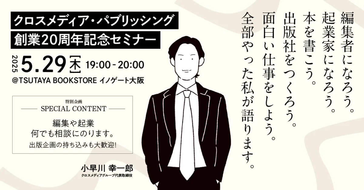株式会社クロスメディア・パブリッシングは、2025年に創業20周年を迎えます。これを記念して、代表取締役社長の小早川幸一郎が自身の経験をもとに、出版や経営について語る特別セミナーを開催します。大阪でのこのイベントは、業界に興味を持つ方々にとって特別な機会となることでしょう。