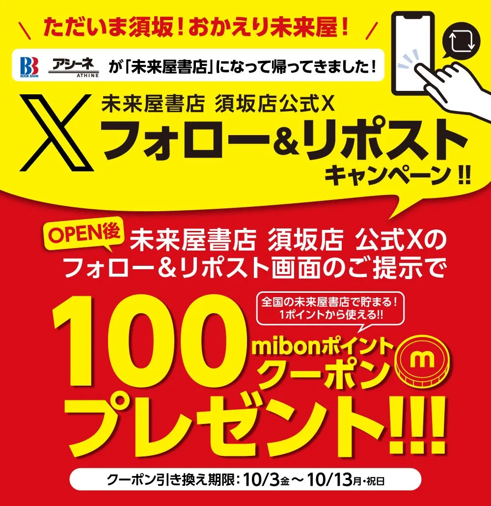 新店舗のオープンを祝して、「ただいま須坂!おかえり未来屋!Xフォロー&リポストキャンペーン」が開催されます。こちらのキャンペーンは、未来屋書店須坂店の公式Xアカウントをフォローし、対象投稿をリポストすることで参加できます。期間は2025年9月5日から10月13日まで。