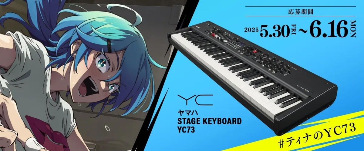 株式会社ヤマハミュージックジャパンは、人気TVアニメ「ロックは淑女の嗜みでして」とのコラボ企画を発表しました。このキャンペーンでは、アニメに登場するキャラクター「院瀬見ティナ」が使用するステージキーボード「YC73」をプレゼントします。
