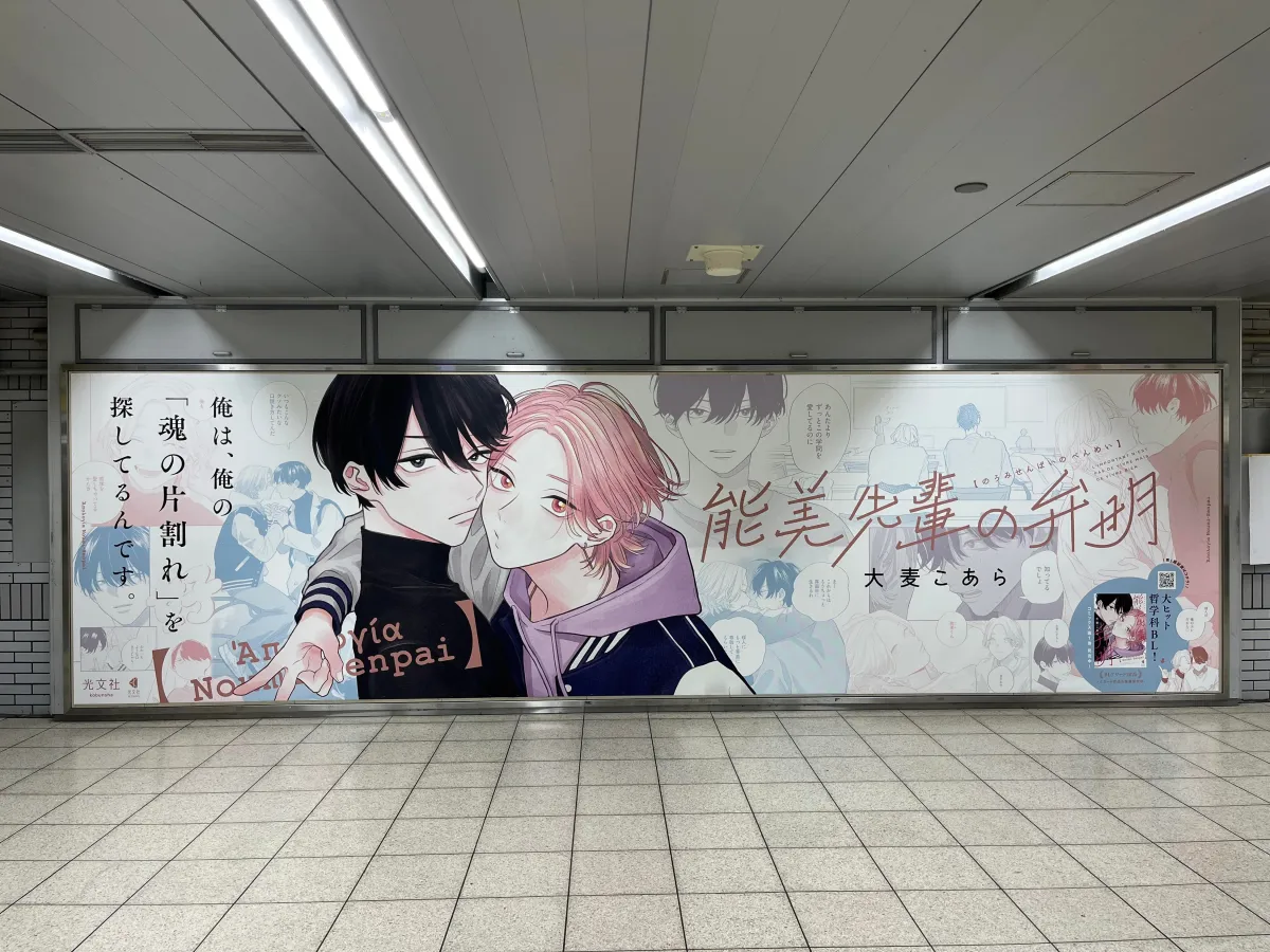 この成功を祝して、「能美先輩大ヒット御礼企画」が2月3日から始まりました。JR池袋駅に掲出されたポスター広告には、作品のビジュアルが使用されており、駅を利用する方々に、作品の魅力をアピールしています。このポスターの掲出場所は、池袋駅北口改札の外にある北通路付近の「パノラマ池袋A」となっています。掲出は2月3日から9日までの間ですので、池袋へお出かけの際はぜひご覧になってください。