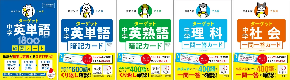 | 高校入試 でる順ターゲット 中学英熟語 五訂版対応 暗記カード | 1,430円(税込) | 2026年3月23日 | 9784010222720 | 文庫判、168ページ、オールカラー、リング6個付 |