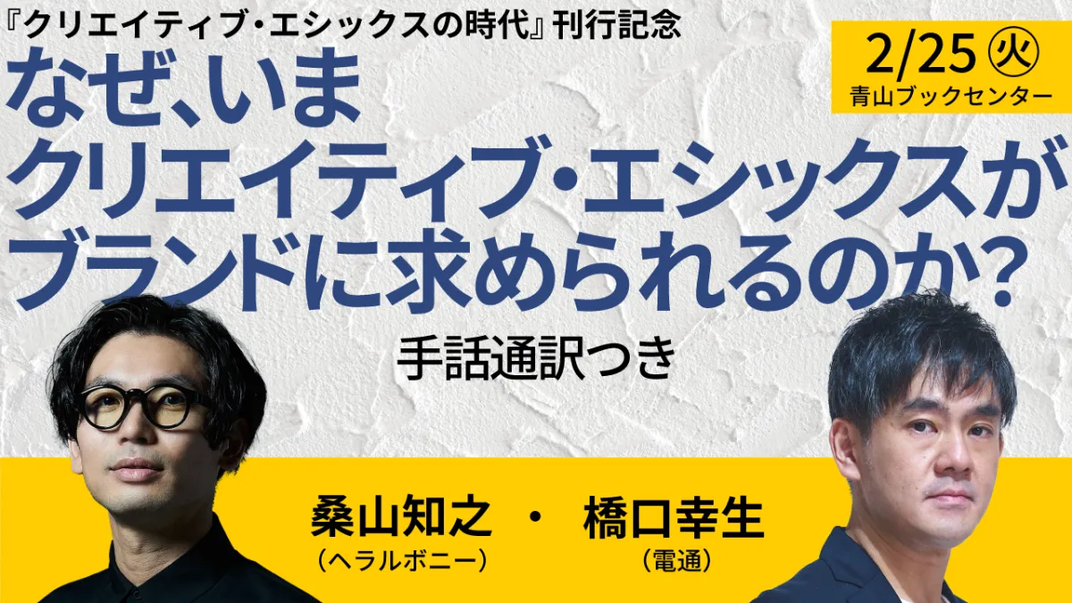 現代のビジネスシーンにおいて、倫理(エシックス)は企業経営やブランディングに欠かせない要素として注目されています。その重要性を再認識するためのイベントが2月25日(火)に青山ブックセンターで開催されます。このトークイベントでは、著者の橋口幸生氏とヘラルボニーのクリエイティブディレクターを務める桑山知之氏が登壇し、今なぜ企業やブランドにおいてクリエイティブ・エシックスが求められるのかを掘り下げます。