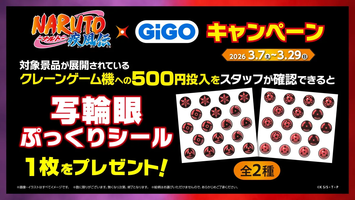 また、GiGOでは「マストバイキャンペーン」も実施されます。対象のクレーンゲームで500円を投入すると、スタッフから「写輪眼ぷっくりシール(全2種)」をランダムプレゼント!