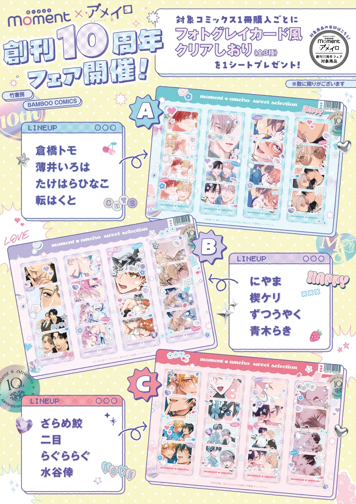 2025年10月30日より、株式会社竹書房が運営する「moment」と「アメイロ」は、創刊10周年を祝う特別フェアを開催します。このフェアでは、対象のコミックスを1冊購入する毎に、豪華な『フォトグレイカード風クリアしおり』(全3種)をプレゼント!