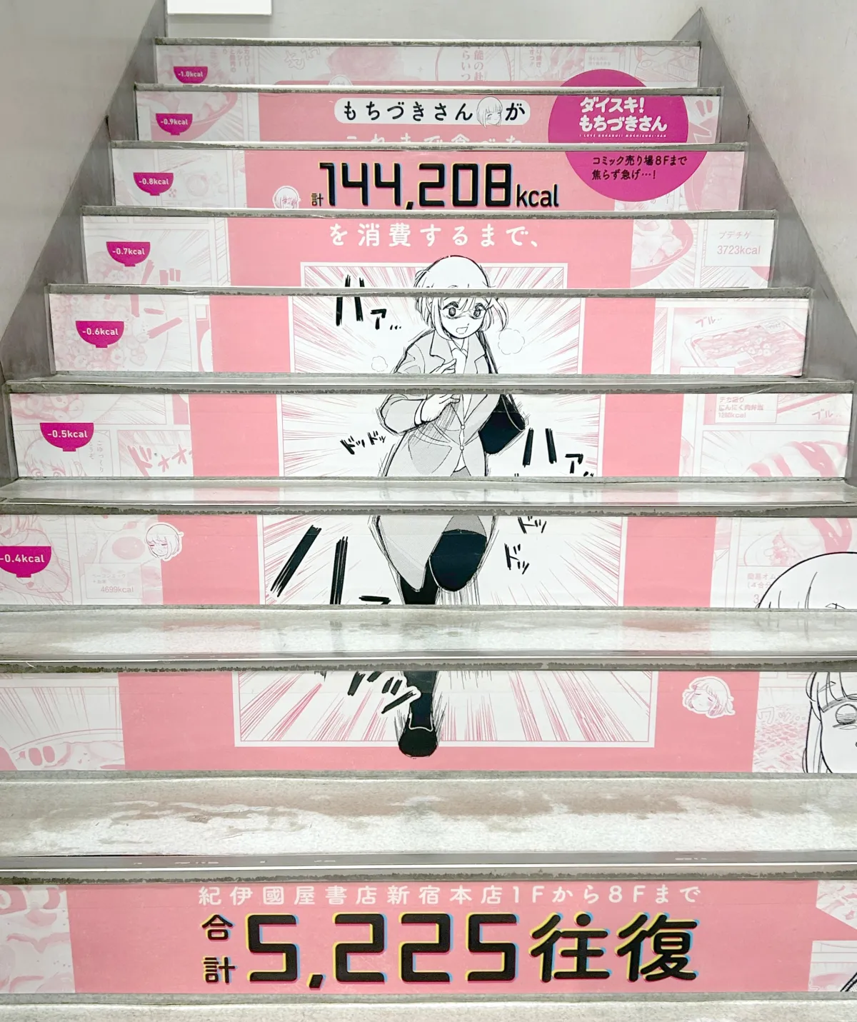 発売を記念して、同書店の1階から2階にかけて「もちづきさんの総カロリー消費広告」が掲出されています。この広告は、もちづきさんがこれまでに食べたカロリーを消費するための楽しい挑戦を提供するもので、来店者が階段を使ってカロリーを消費できる仕組みです。具体的には、5225往復することで、もちづきさんの食べたカロリーを相殺できるという驚きの内容!一段昇る・降りるごとに0.1kcalの消費が見込まれています。