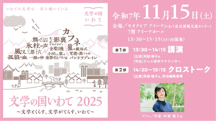 岩手県では、文学に対する関心を高めるための「文学の国いわて推進事業」が進められています。その一環として、2025年11月15日(土)に「カフネ」で本屋大賞を受賞した作家・阿部暁子氏の特別講演会が、キオクシアアイーナで開催されます。今回は8回目となるこの講演会、県民にとって大変貴重な機会です。