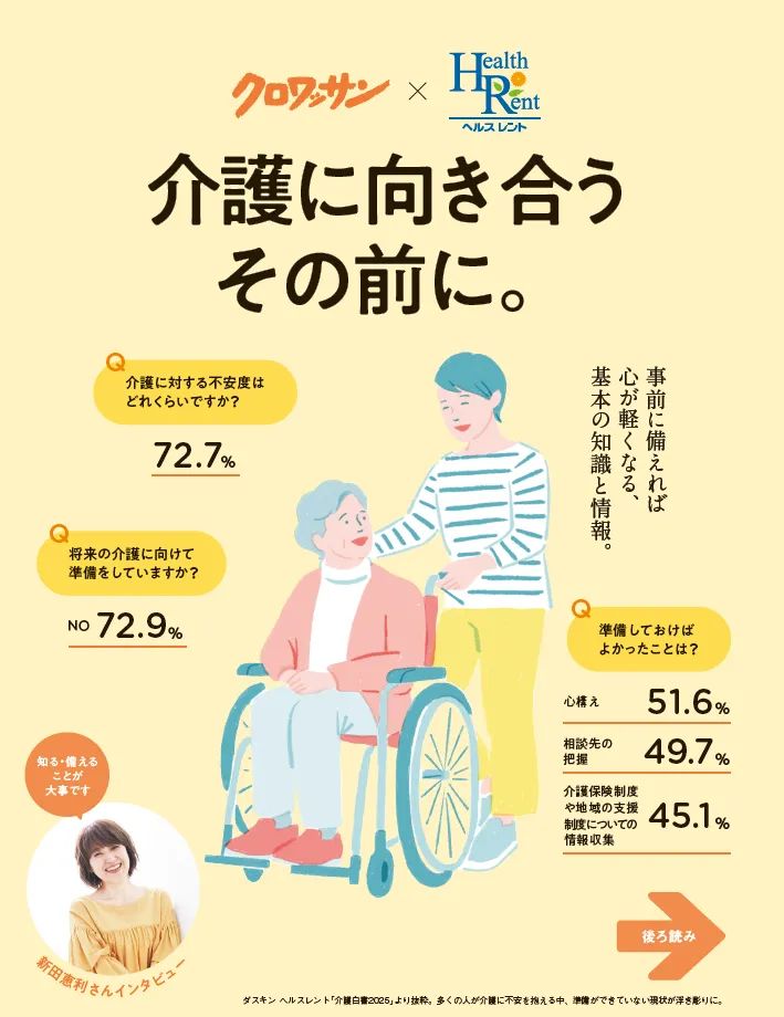 介護が訪れる瞬間は、誰にでも突然やってくるものです。それは病気やケガ、思いがけない状況によるものかもしれません。このような時、私たちがどう動けば良いのか、また、正しい知識を持つことの大切さについて考えてみましょう。『クロワッサン』編集部が株式会社ダスキンと協力して実施した企画では、介護に向き合うための基本的な情報を8ページにわたってまとめています。同企画は、9月10日発売のNo.1149からスタートし、さらには特別編集MOOK「はじめての介護」にも再録される予定です。