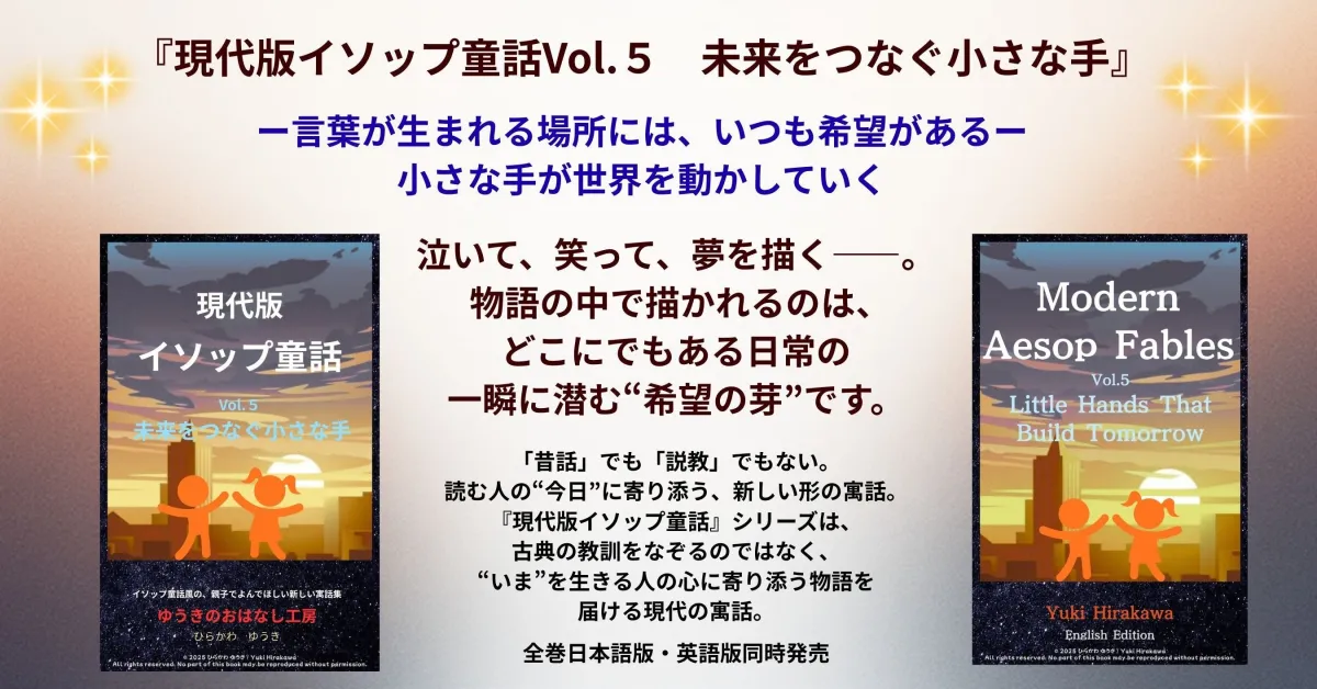 新刊『現代版イソップ童話 Vol.5未来をつなぐ小さな手』が、著者ひらかわゆうきによって発表されました。この作品は、彼の人気シリーズ『現代版イソップ童話』の最新巻で、子どもたちの想像力とやさしさに焦点を当てた五つの短編を収録しています。