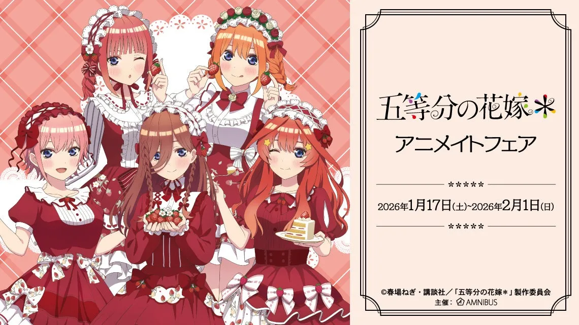 2026年1月17日(土)から2月1日(日)にかけて、アニメイト各店舗で「TVスペシャルアニメ『五等分の花嫁*』アニメイトフェア」が開催されることが発表されました。このイベントは、人気漫画・アニメ「五等分の花嫁」を題材にしたもので、ファン必見のスペシャルな内容が盛りだくさんです。