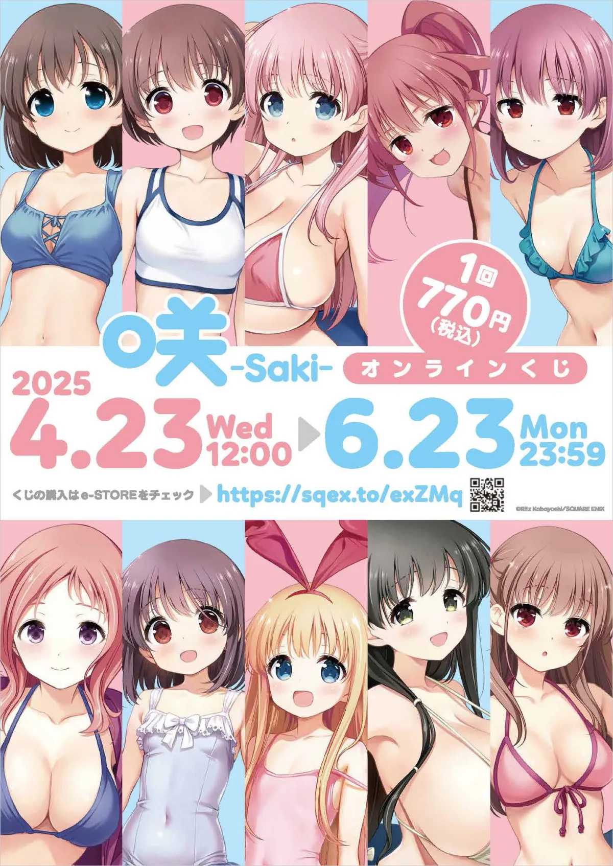 2025年4月23日正午、スクウェア・エニックスのe-STOREにて待望の「咲-Saki-」オンラインくじの予約が開始されました。このくじは、ヤングガンガンの創刊20周年を祝う特別企画として、人気キャラクターたちが勢揃いする企画です。参加キャラクターは300人以上。中から選ばれたトップ10メンバーを小林立先生が新たに描き下ろし、魅力的な新作水着イラストを使用した商品が当たるという豪華な内容です。