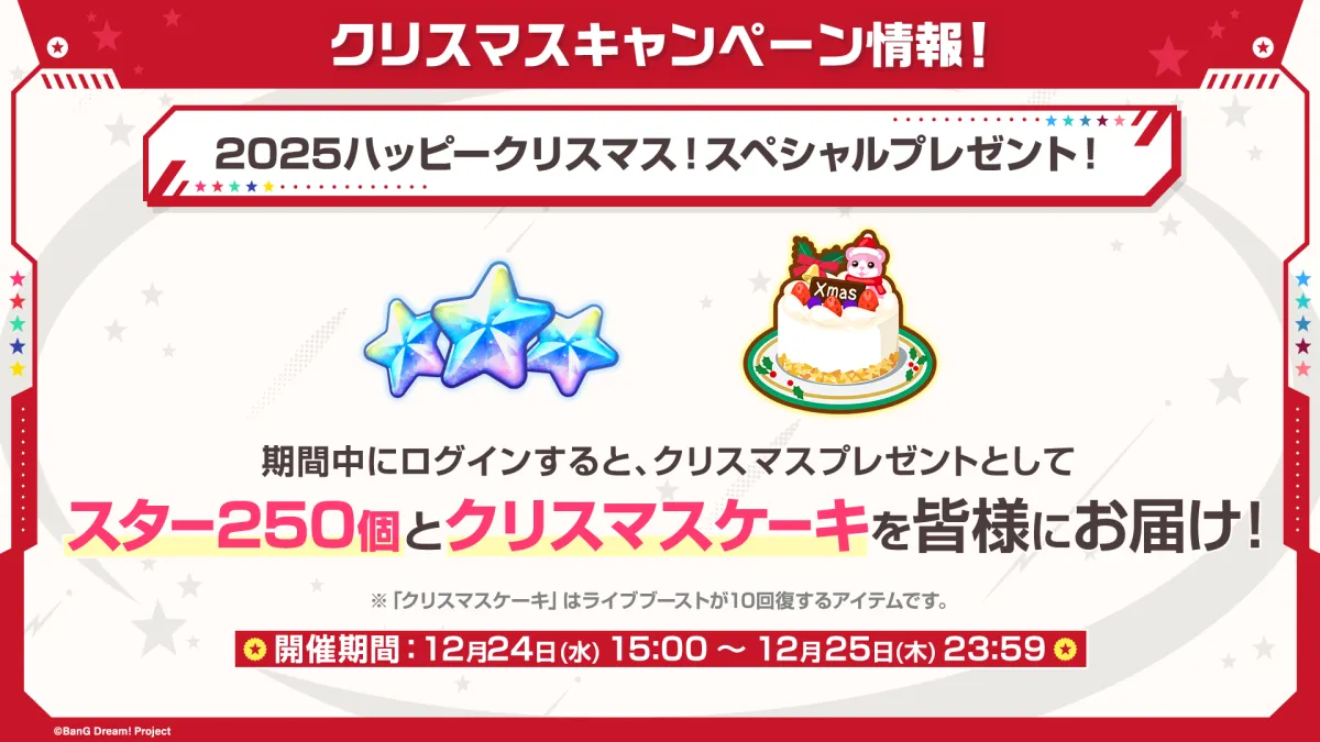 まず注目は、12月24日に始まる「2025ハッピークリスマス!スペシャルプレゼント!」です。この期間中にログインすると、スター250個とクリスマスケーキ(ライブブースト10回復)が贈られます。