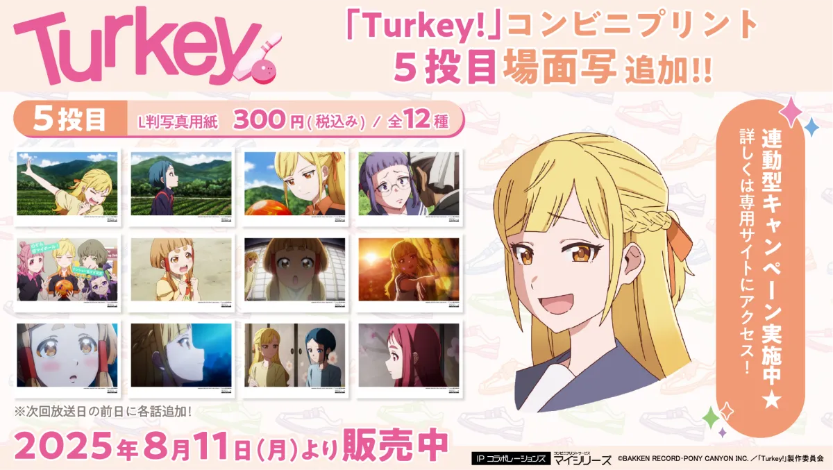 TVアニメ『Turkey!』のコンビニプリントサービスは、視聴者に愛されるキャラクターの特製アイテムを手に入れる絶好の機会です。放送終了の翌週には、各話から厳選された12点の「場面写」やキャラクターの「シール」、さらに「ポスター&ブロマイド」がプリント可能です。これにより、自分だけのコレクションを作成する楽しみが広がります。