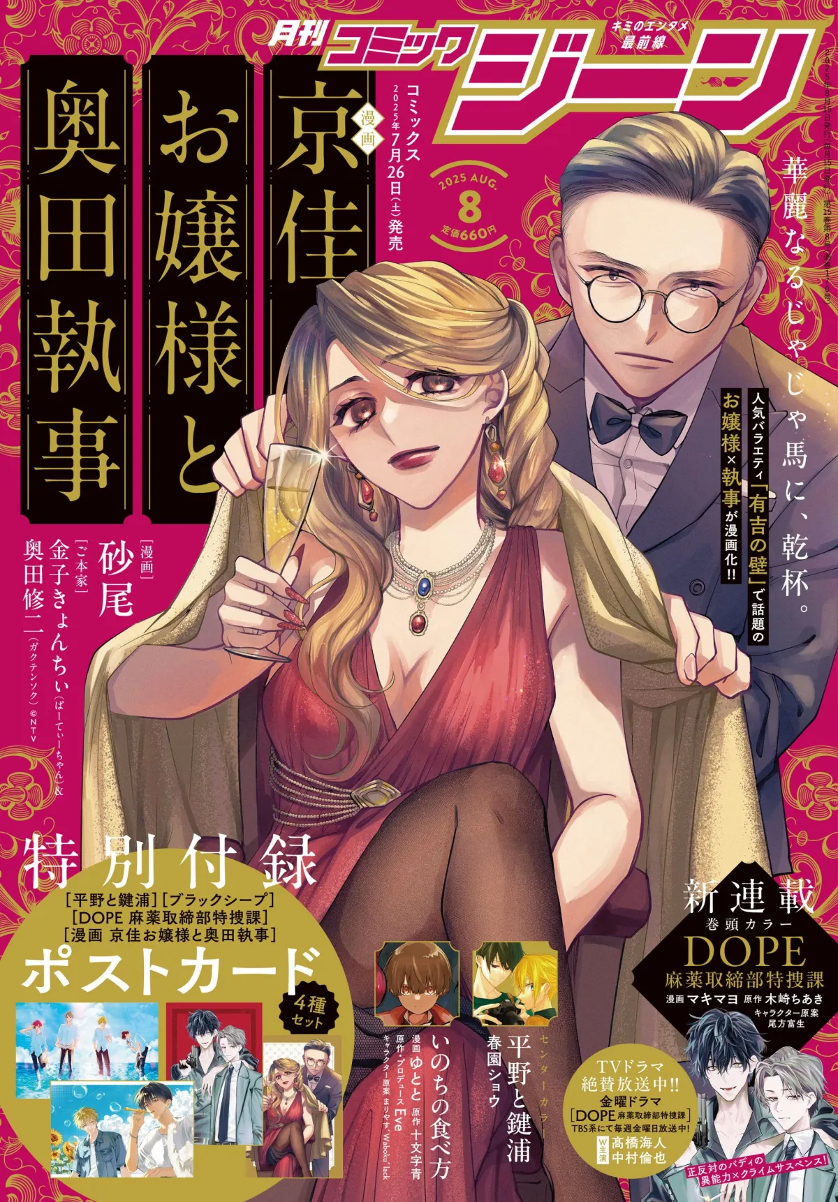 さらに、「月刊コミックジーン8月号」には、特別付録として『平野と鍵浦』『ブラックシープ』『DOPE 麻薬取締部特捜課』『漫画 京佳お嬢様と奥田執事』の4種のポストカードセットが付いてきます。ファンにとってはコレクション必至のアイテムです!