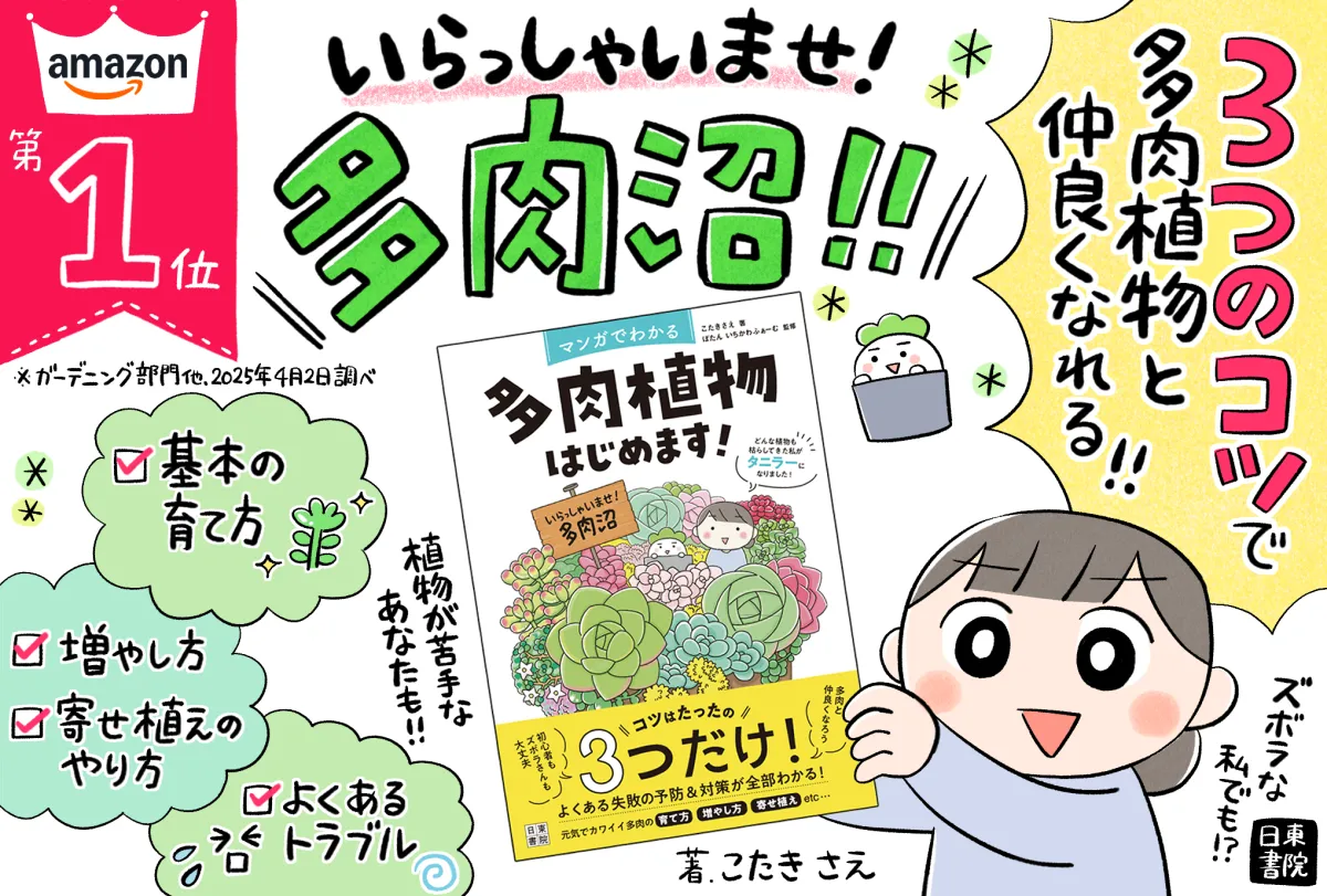 2025年4月18日、全編マンガで表現された楽しい多肉植物の入門書『マンガでわかる 多肉植物はじめます!』が発売されました。この書籍は、初心者が多肉植物を育てるための知識を、ストーリーを通じて楽しく学べる内容となっています。