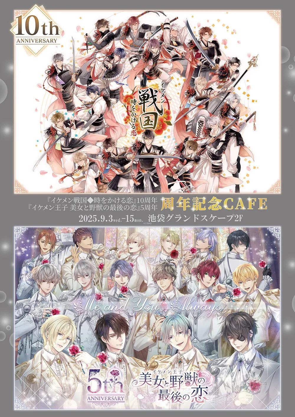 2025年の9月3日から、池袋の「THEキャラCAFE グランドスケープ池袋店」にて、株式会社コンテンツシードと株式会社サイバードの人気恋愛ゲームシリーズ、2つの特別コラボカフェが開設されます。このイベントは、『イケメン戦国◆時をかける恋』が10周年、『イケメン王子 美女と野獣の最後の恋』が5周年を迎えることを記念しています。
