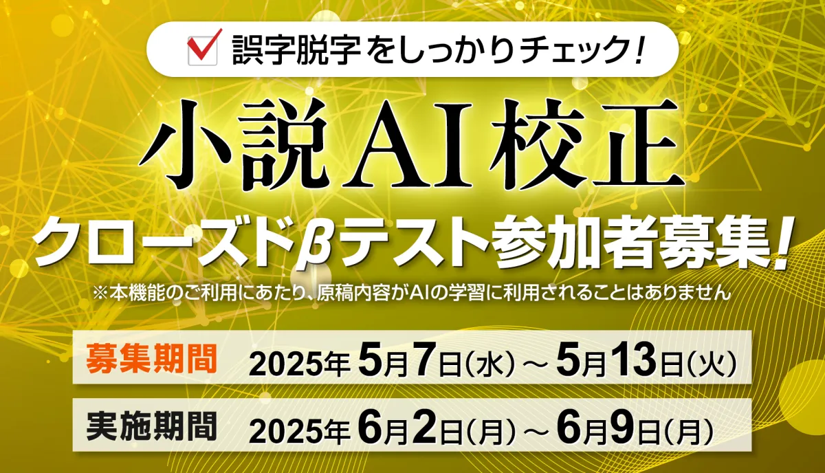 テストに参加することで、自分の作品をAI校正機能で無料で校正できるチャンスを得られます。校正後の原稿は、テスト終了後も公開できるため、自身の作品を広める良い機会ともなるでしょう。