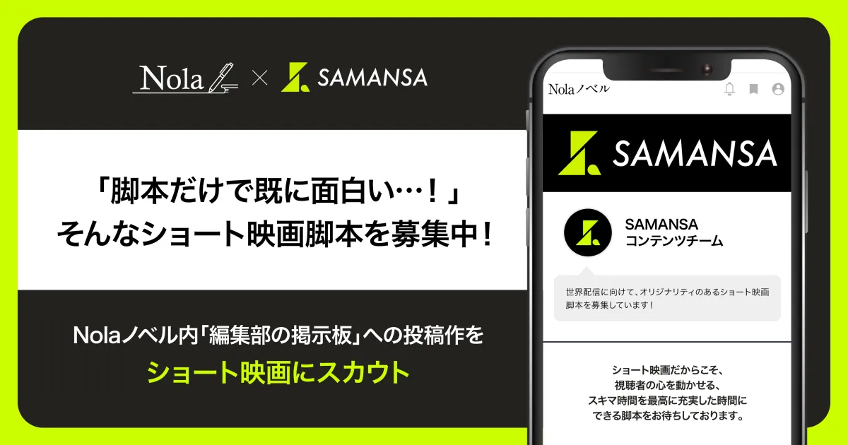 創作プラットフォーム「Nola」を提供する株式会社indentとショート映画配信サービス「SAMANSA」を運営する株式会社SAMANSAが、新たにショート映画脚本の募集を開始することを発表しました。この取り組みは、60万人以上の作家と250万を超える作品が集まる「Nola」のネットワークを活用し、SAMANSAの特徴である高品質なショート映画の提供を促進することを目指しています。