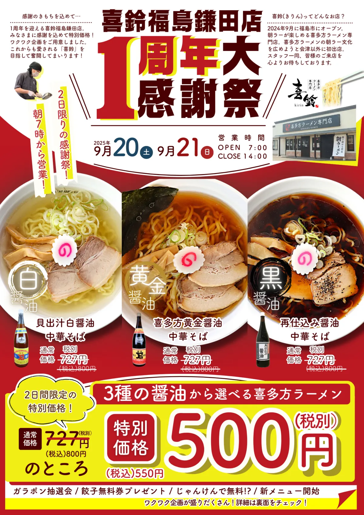 喜多方ラーメン専門店喜鈴1周年記念イベント!