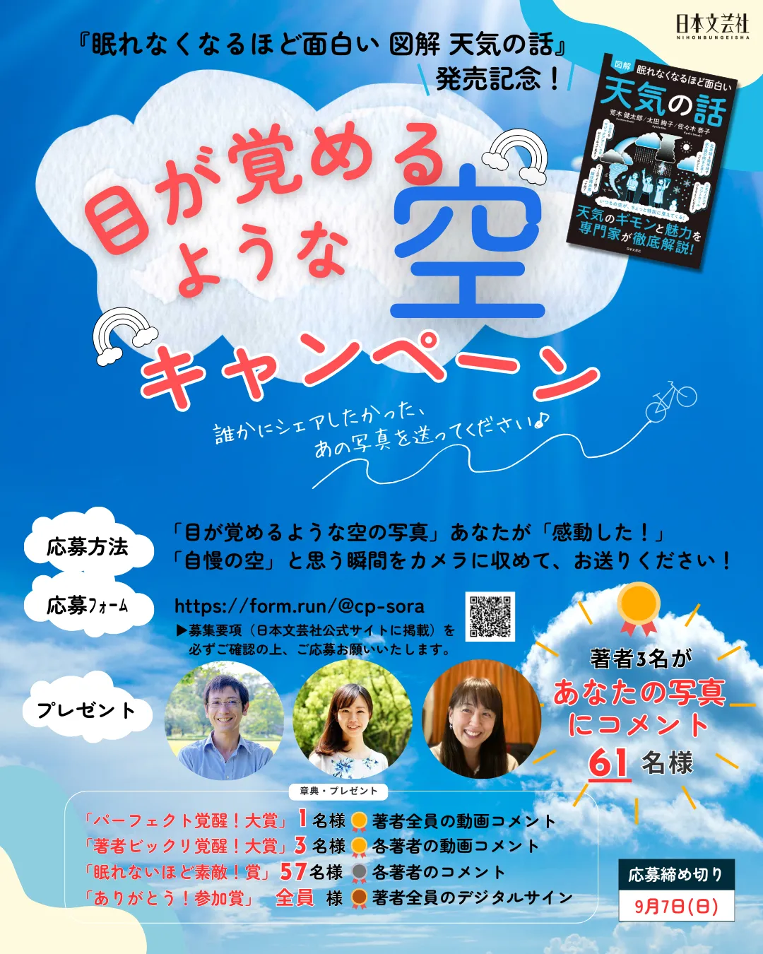 キャンペーンに関する詳細や疑問点は、「目が覚めるような空」キャンペーン事務局までお問い合わせください。メールアドレスは、promotion@nihonbungeisha.co.jp です。