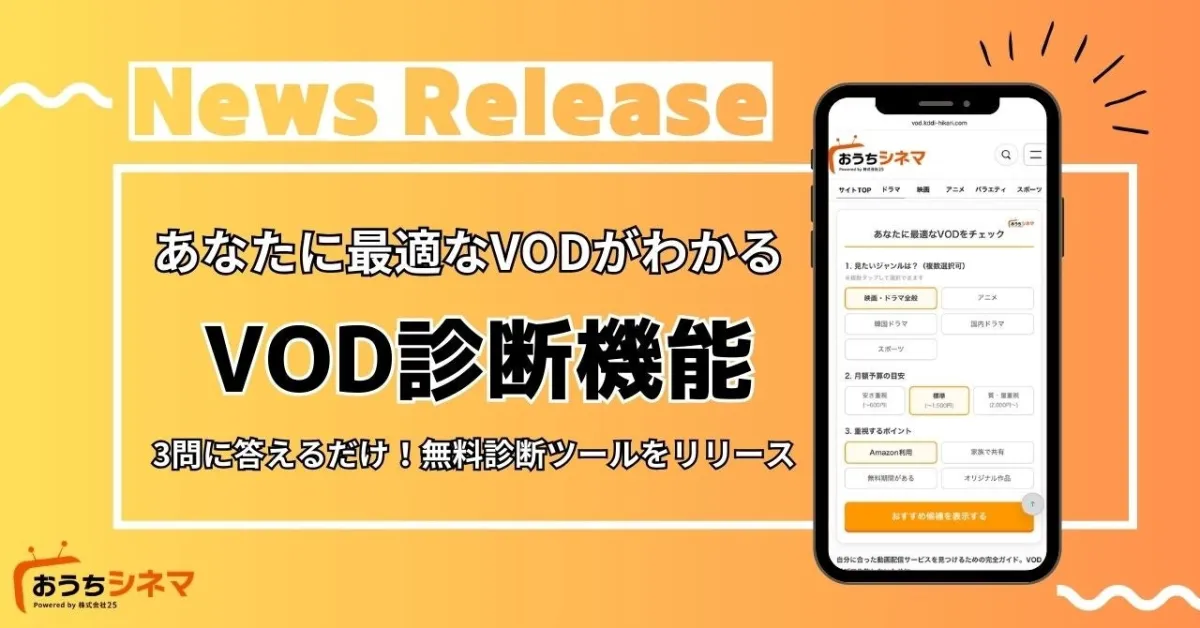 動画配信サービス(VOD)の比較メディア『おうちシネマ』が、2026年3月17日に新機能「VOD診断機能」を追加しました。この革新的な機能は、わずか3つの質問に答えるだけで、自分にぴったりの動画配信サービスを見つける助けとなります。この診断は登録不要で完全無料、スマートフォンやPCから簡単に利用できるため、忙しい現代人にも最適です。