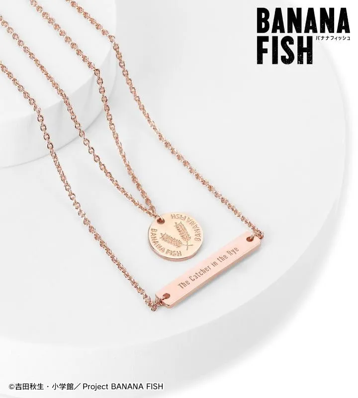 このネックレスは、作品のエンディングシーンをイメージしたライ麦畑のデザインが特徴です。メインのプレートには、第24話のタイトルが刻印され、その裏にはアッシュと英二の名前、そして作品カラーである鮮やかな黄色いストーンがあしらわれています。サブパーツの円形プレートには、エンディングを象徴するライ麦のデザインと作品名が描かれています。