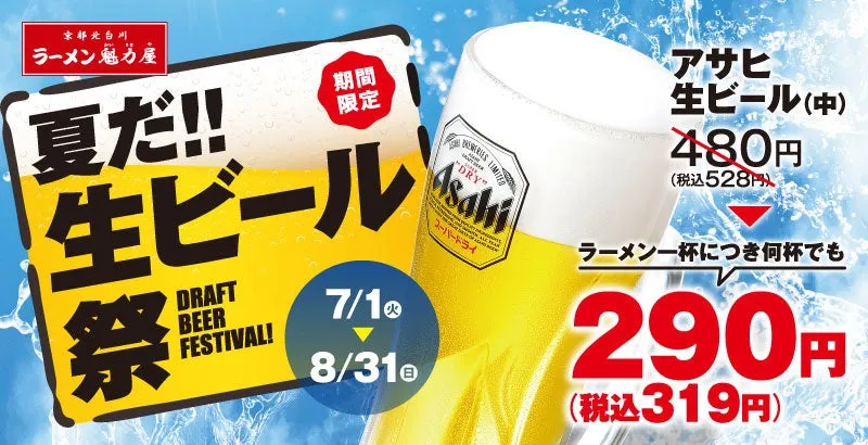 暑い夏がやってきました。今年もまた、ラーメン魁力屋が「夏だ!!生ビール祭」を開催します。期間は2025年7月1日から8月31日までの2ヶ月間。ラーメン一杯を注文すると、通常528円の生ビールが何杯でもたった319円(税込)で楽しめるという、まさに神コスパのイベントです!