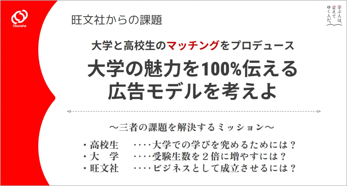 2025年度の「探究Ⅱ」では、旺文社は大学と高校生を結びつける新しい広告モデルを考える課題を提供します。受験生の減少や入試方式の複雑化など、大学と高校生が抱える様々な問題を検討する中で、旺文社が発信する受験情報誌やWebサービスを活用した効果的な広告プランを考案することが求められます。この授業は、高校生自身が積極的に意見を出し合う形で進められ、大学の魅力を100%伝える方法を模索する内容です。