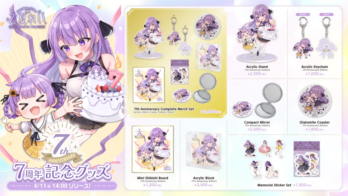 また、複数アイテムをまとめてお得に手に入れられる「7th Anniversary Complete Merch Set」も用意されています。これらの記念商品は、単品購入よりもお得な価格設定になっており、より多くのファンが乙夏れいとその活動を楽しむ機会を提供しています。
