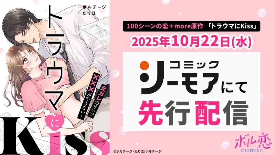 新しいオフィスラブコメディとして注目を集める作品、「トラウマにKiss~元カレのせいで×××ができない!」が、2023年10月22日(水)にコミックシーモアで先行配信を開始しました。この作品は、株式会社ボルテージの人気タイトル「100シーンの恋+more」内にて配信中の「トラウマにKiss~やっかいな恋、対応中」を原作としたコミカライズで、漫画家のたりほ先生が美麗な絵で物語を届けます。