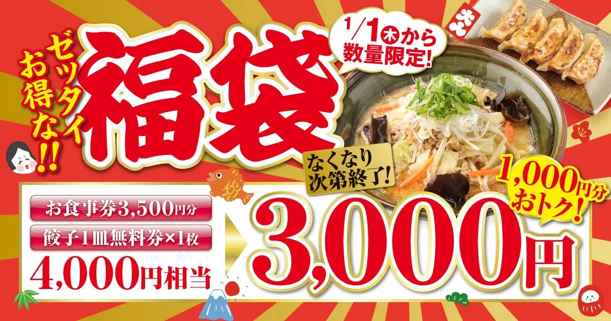 福袋は、発行店舗のみで使用可能です。餃子一皿無料券はラーメンを注文した方に限り使用でき、年末年始に休業の店舗もありますので、注意が必要です。