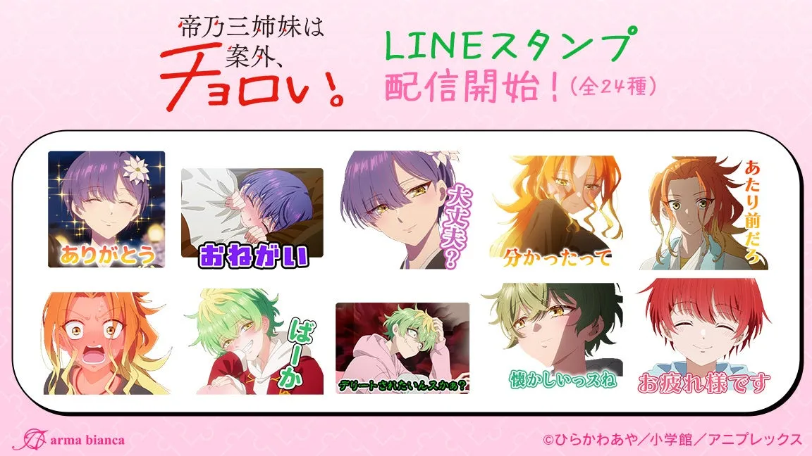 TVアニメ『帝乃三姉妹は案外、チョロい。』のファンに朗報です! 10月1日(水)より、LINEスタンプと着せかえが配信開始されました。これにより、喜びを共有したり、日常の会話をもっと楽しくするためのアイテムが手に入るとあって、多くのファンが期待を寄せています。