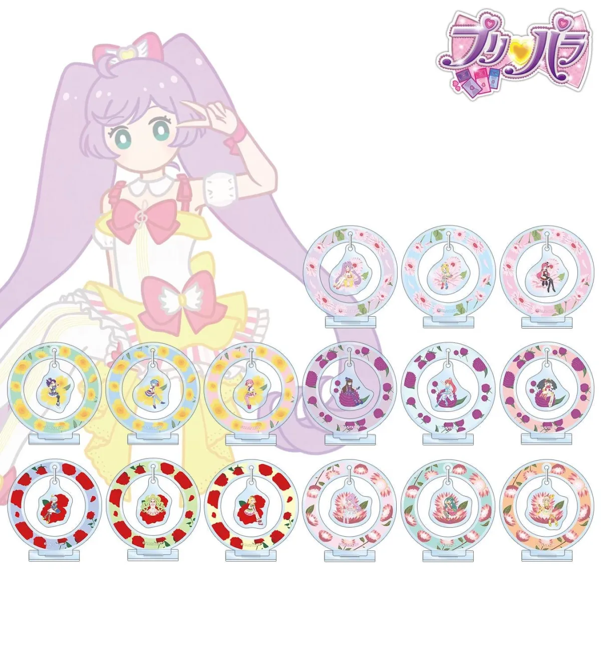 一部キャラクターの新しいイラストデザインをボタニカルスタイルで落とし込み、アクリルスタンドとして仕上げました。真中らぁらや南みれぃなど、全15種からお気に入りのキャラクターを選んで、デスクや部屋を彩るアイテムとして楽しむことができます。