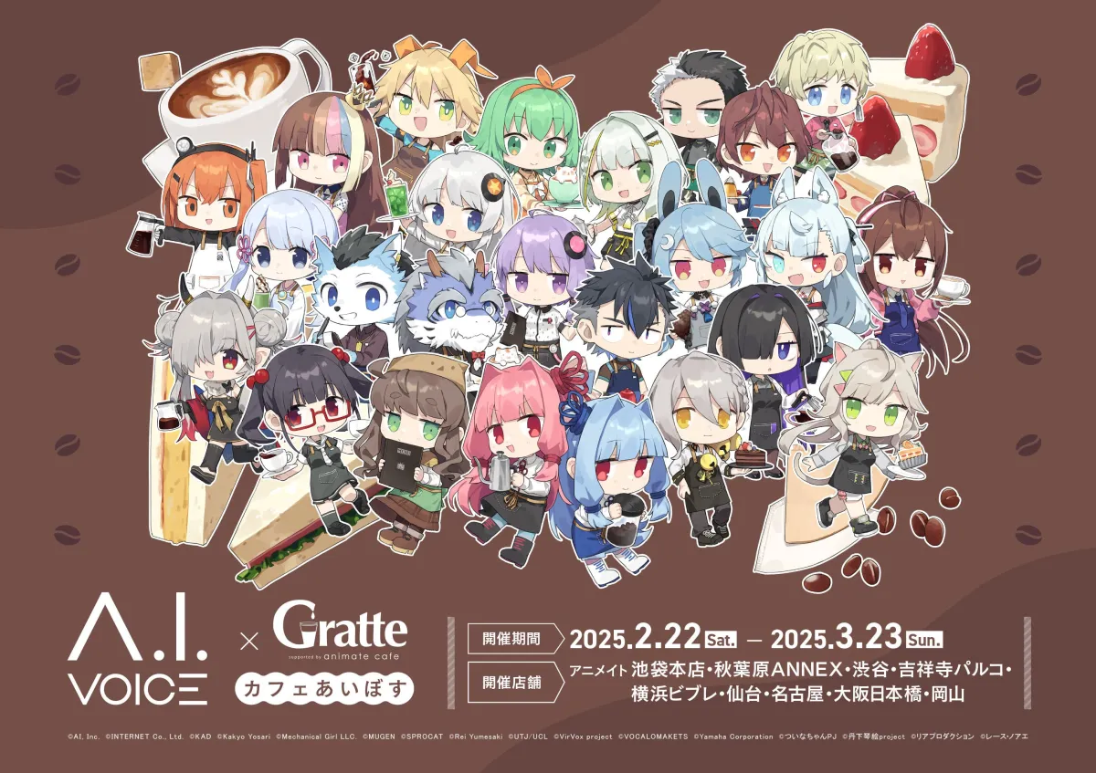 この度、高品質AI音声合成技術を持つエーアイ社と、アニメの聖地として知られるアニメイトが手を結び、特別なコラボカフェ「カフェあいぼす」を2025年2月22日から3月23日までの約1カ月間、全国のアニメイト9店舗にて開催することが発表されました!