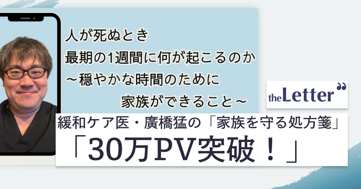株式会社OutNowが運営する執筆プラットフォーム「theLetter」で公開された緩和ケア医・廣橋猛氏の特別な記事が、驚くべき30万PVを突破しました。この数字は、広く読まれることができたその内容の重要性を物語っています。