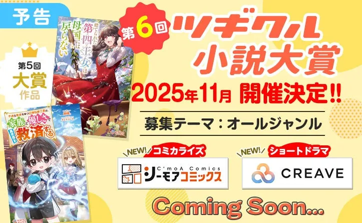 2025年11月5日(水)から2026年1月6日(火)にかけて、WEBコンテンツポータルサイト「ツギクル」が主催する「第6回ツギクル小説大賞」の応募が開始されます。本賞は、業界トップクラスの電子書籍レーベル「シーモアコミックス」とショートドラマを手掛ける株式会社CREAVEとの協力によって開催され、新たな才能の発掘を目指しています。
