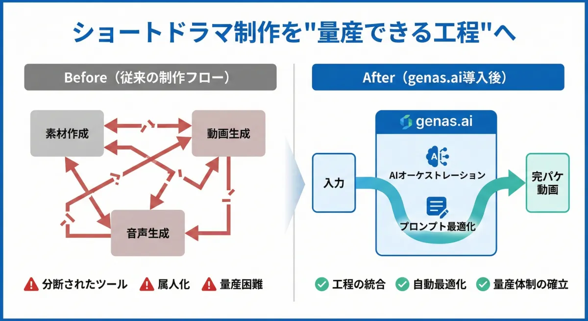 映像制作の世界に新たな風が吹き込まれました。今回は、株式会社ニュウジアが開発したAI動画生成プラットフォーム「genas.ai」をご紹介します。この革新的なプラットフォームは、ショートドラマやショートアニメを効率的に製作するための「量産できる工程」を実現しています。