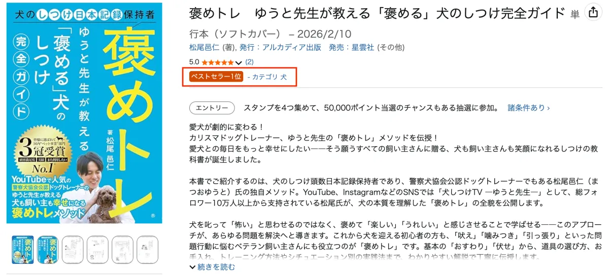 最近、犬のしつけ方法は多様化していますが、その中でも特に注目を集めているのが、Tokyo Dogsの代表を務める松尾邑仁先生の初著書『褒めトレ ゆうと先生が教える「褒める」犬のしつけ完全ガイド』です。この本が2026年2月10日に発売された後、Amazonの犬部門においてベストセラー第1位を獲得しました。これは、犬のしつけに関心を持つ多くの飼い主たちから高い支持を受けている証拠です。