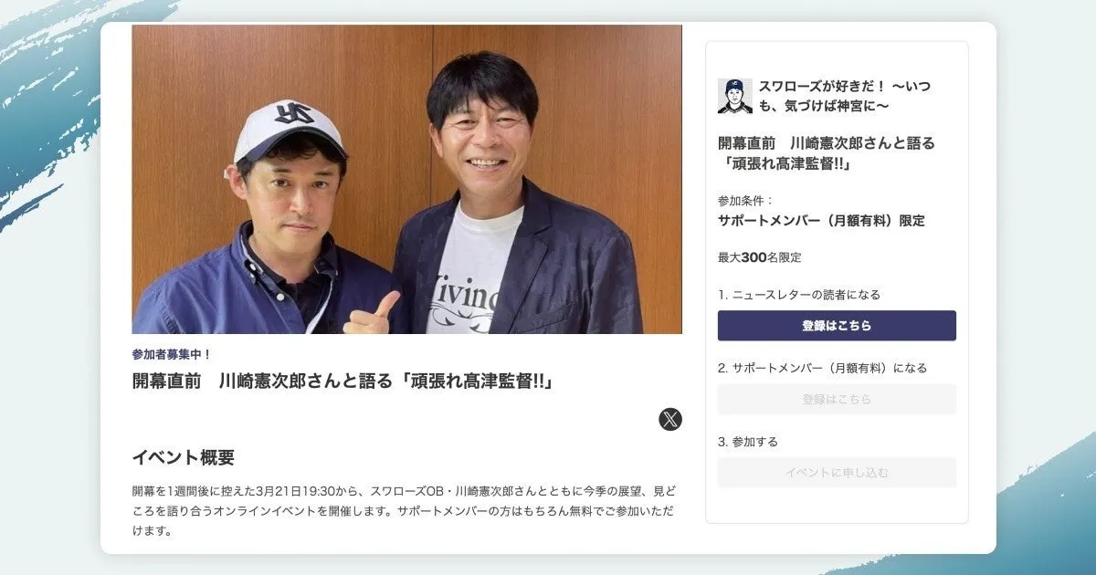 実際の活用事例として、ノンフィクションライターの長谷川晶一さんが運営する「スワローズが好きだ! ~いつも、気づけば神宮に~」では、元プロ野球選手の川崎憲次郎さんをゲストに招いたオンライントークイベントが好評を得ました。この成功を受けて、次回の開催も決定しており、非常に期待が高まっています。