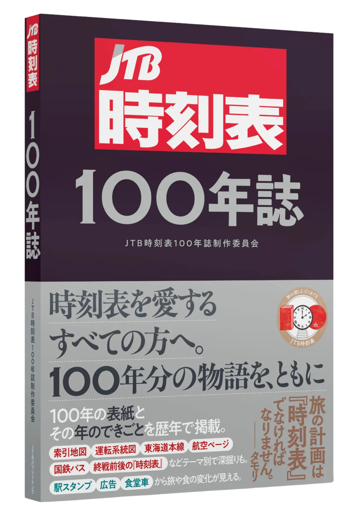 『JTB時刻表』は、大正14年(1925年)に鉄道省運輸局の監修の下に初めて発刊され、以来100年間にわたり、鉄道ファン、旅行者、さらには日常の生活にかかせない交通手段として多くの人々に親しまれてきた。その間、数多くの事件や出来事が時刻表と共に歩んできたため、本書では歴代の表紙や路線図、列車編成表などを年表形式で整理し、時代背景を詳しく説明している。