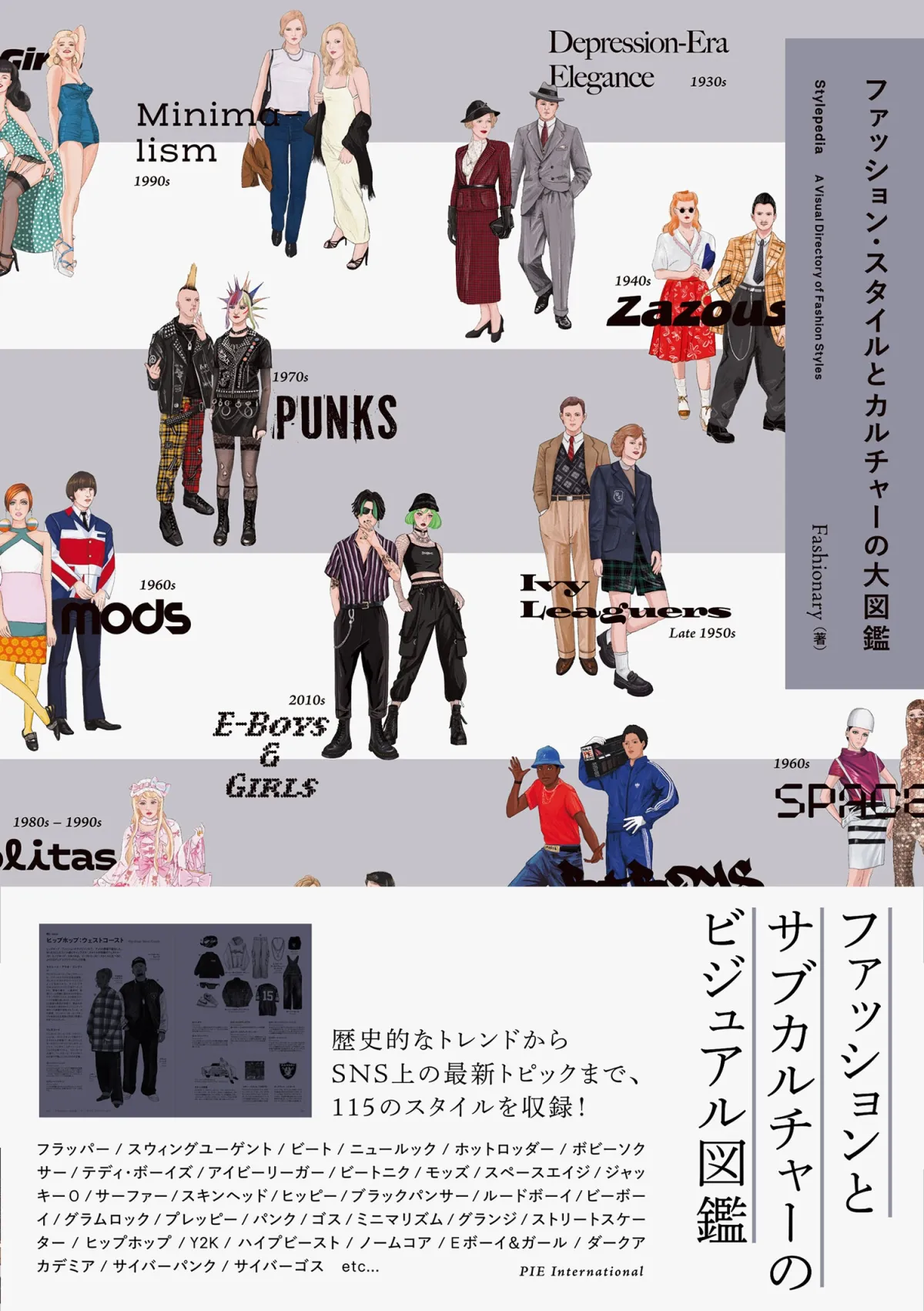 本書では、1920年代から2010年代までの100年間にわたり、115種類のファッションスタイルを図鑑形式で網羅。流行の背景には、時代による社会的変化が大きく影響していることを理解するための貴重な資料が提供されています。歴史的なトレンドだけでなく、知名度の低いサブカルチャーや現代のSNSトピックにまで触れられており、幅広い視点からファッションを探索することができます。