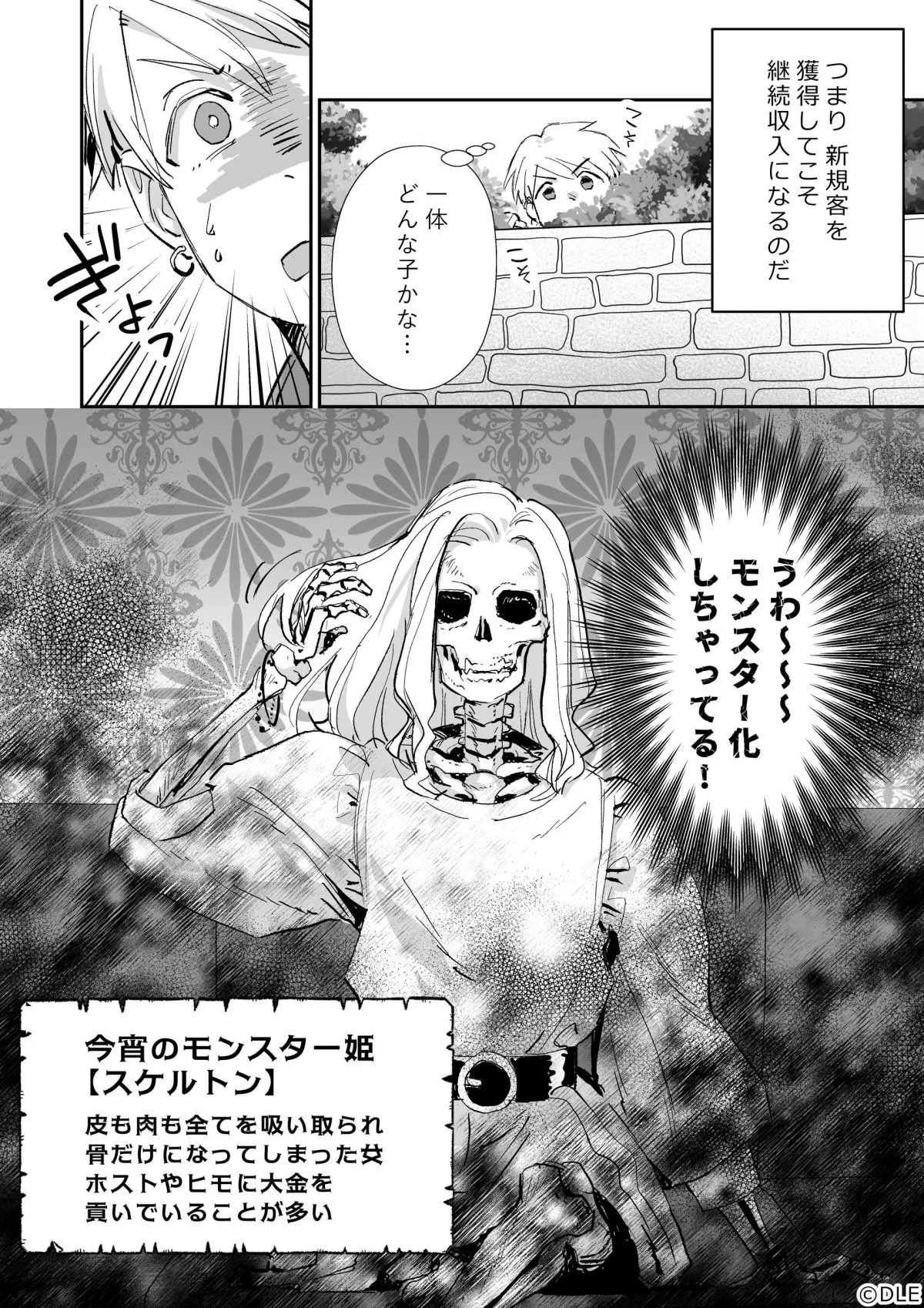 物語はホストクラブ「ツクヨミ」で始まります。訪れたのは、皮も肉もなくなり、骨だけの姿になってしまったスケルトン。彼女は彼氏に大金を貢いで痩せこけてしまったモンスターです。自らの置かれた状況を認めたくないスケルトンに対し、若手ホストの勇人とベテランホストの恋がどのように接客し、彼女の悩みを浄化していくのかが展開されます。