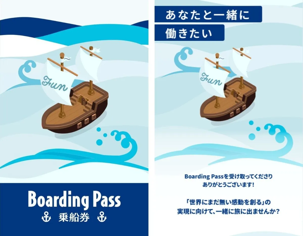 今回新たに制作された「Boarding Pass」は、社員が簡単にウェイブの魅力を伝えるためのツールです。デザインは、ウェイブの社名の意味を反映しており、インターネットの世界で革新を起こす「波」を表現しています。このカードには、「ウェイブという船に一緒に乗り込み、未来に向かって一緒に進もう」というメッセージが込められています。