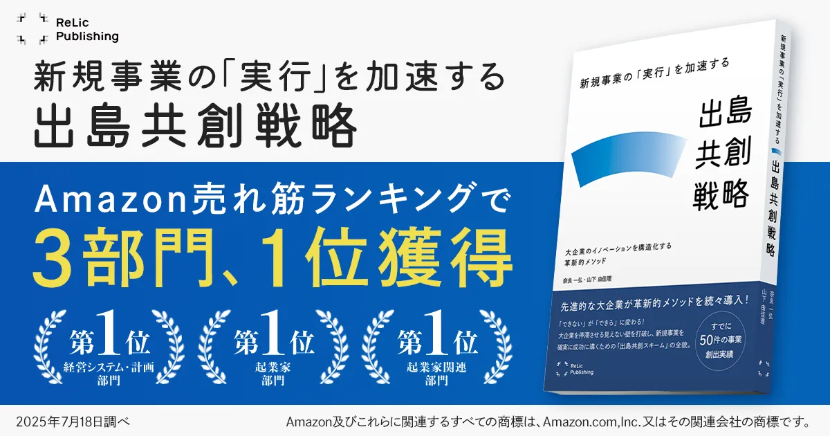 株式会社Relicが事業共創を通じて提言する新しいビジネスの形が、書籍という形で形になりました。2025年7月17日発売の『新規事業の「実行」を加速する出島共創戦略』は、発売から短期間でAmazonの売れ筋ランキングで経営システム・計画部門、起業家部門、起業家関連部門の3つで1位を獲得する快挙を成し遂げました。