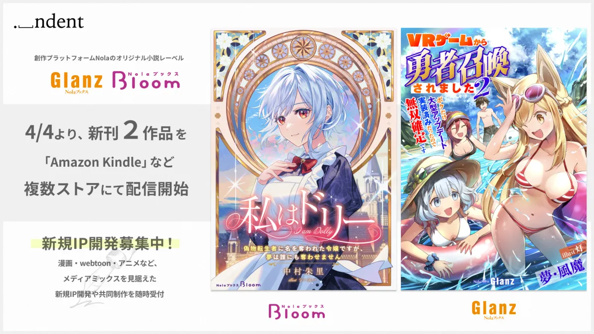 indentでは、小説やマンガ、Webtoonに至るまで、さまざまな創作活動をサポートする環境を提供しており、新たな作家の商業デビューも応援しています。創作プラットフォーム「Nola」において多くの作家の皆様に素敵な物語を届けるお手伝いをし、共に成長することを目指しています。今後の進化にぜひご注目ください!