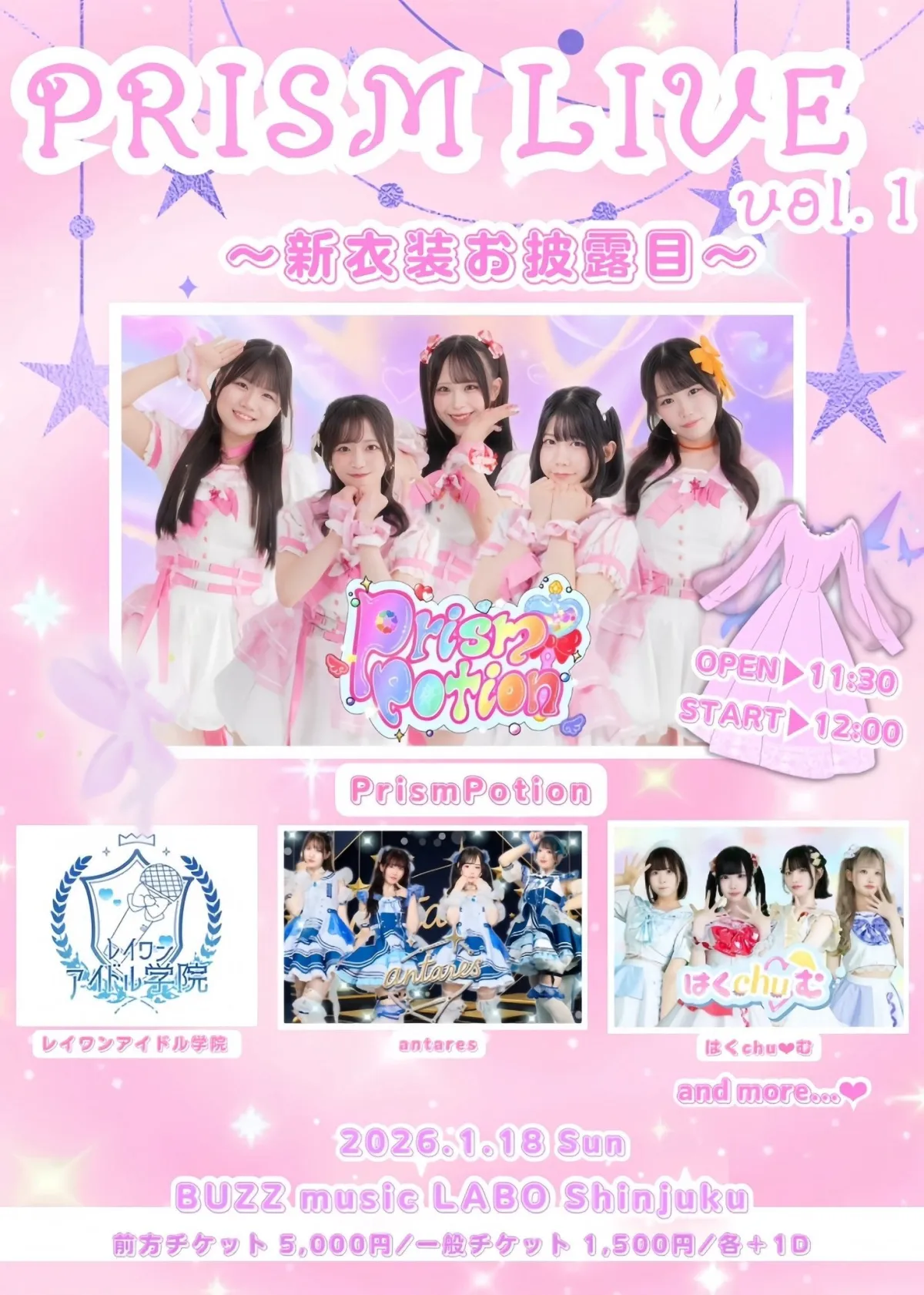 アイドルグループPrismPotion(プリズムポーション)が、2026年1月18日(日)に新宿のBUZZ music LABOで自身初の主催ライブ「PRISM LIVE vol.1 〜新衣装お披露目〜」を開催することが決定しました。この特別なイベントでは、PrismPotionの新衣装を初めてお披露目するほか、Wonder Fieldに所属する他のアイドルグループやゲストアイドルも出演し、多彩なパフォーマンスが楽しめる一日になります。
