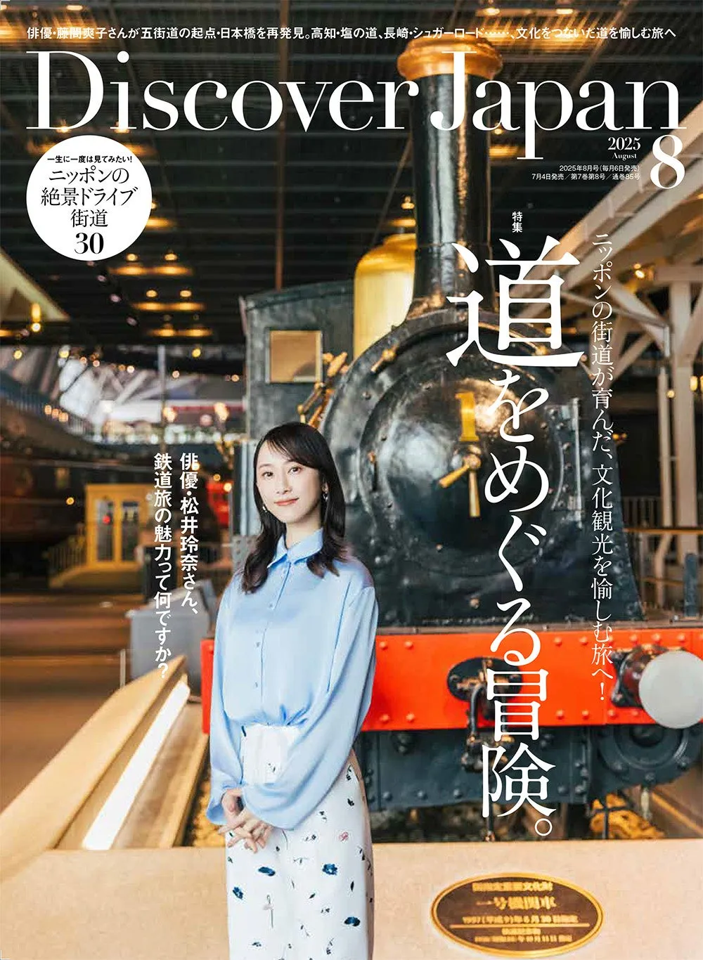 2025年8月号の『Discover Japan』は、特集「道をめぐる冒険」。この号では、“道”をテーマにした土地の文化を味わう旅が紹介されています。特に巻頭では、歴史的な要衝である日本橋において、都市形成史家の岡本哲志さんと俳優の藤間爽子さんが道を巡る楽しみを探ります。