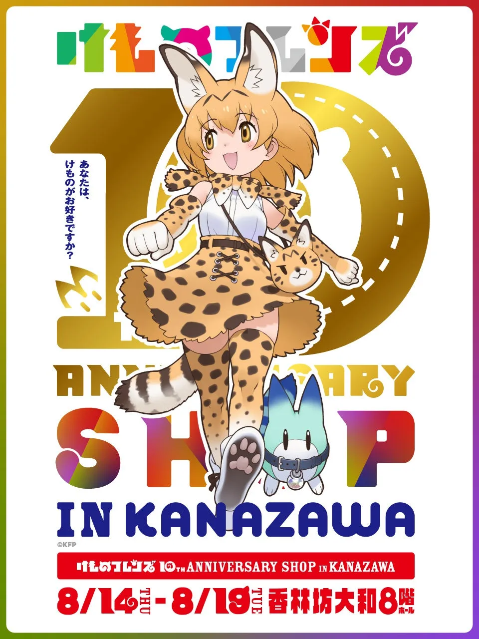 本イベントは「けものフレンズ 10th ANNIVERSARY SHOP IN KANAZAWA」として、2025年8月14日(木)から8月19日(火)までの6日間、石川県金沢市の香林坊大和8階ホールで開催されます。営業時間は日中の10:00から19:00まで、最終日のみ17:00に終了します。