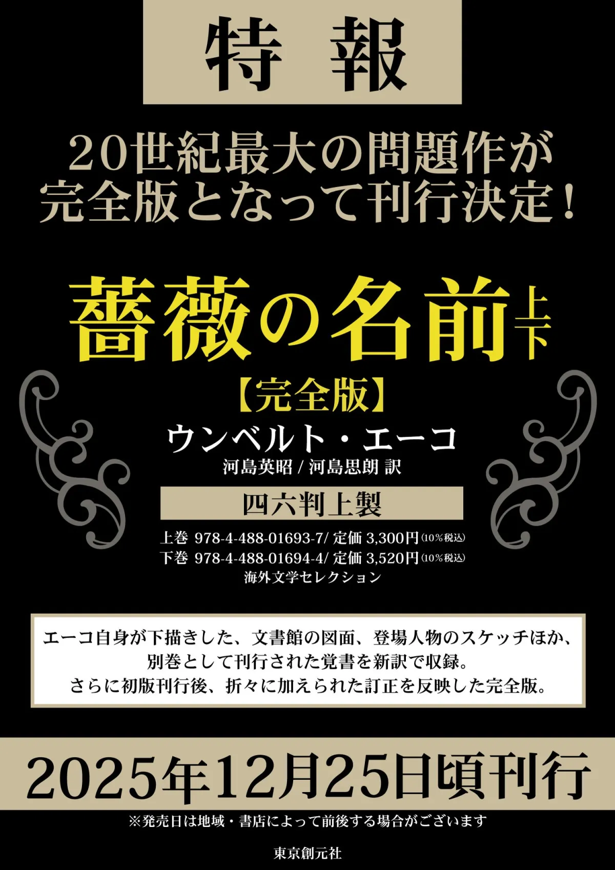 ウンベルト・エーコの名作『薔薇の名前』が、2025年12月25日頃に東京創元社から完全版として再発売されることが発表されました。この小説は、20世紀の文学において特異な存在感を放つ作品の一つであり、世界中で多くの読者に愛され続けています。