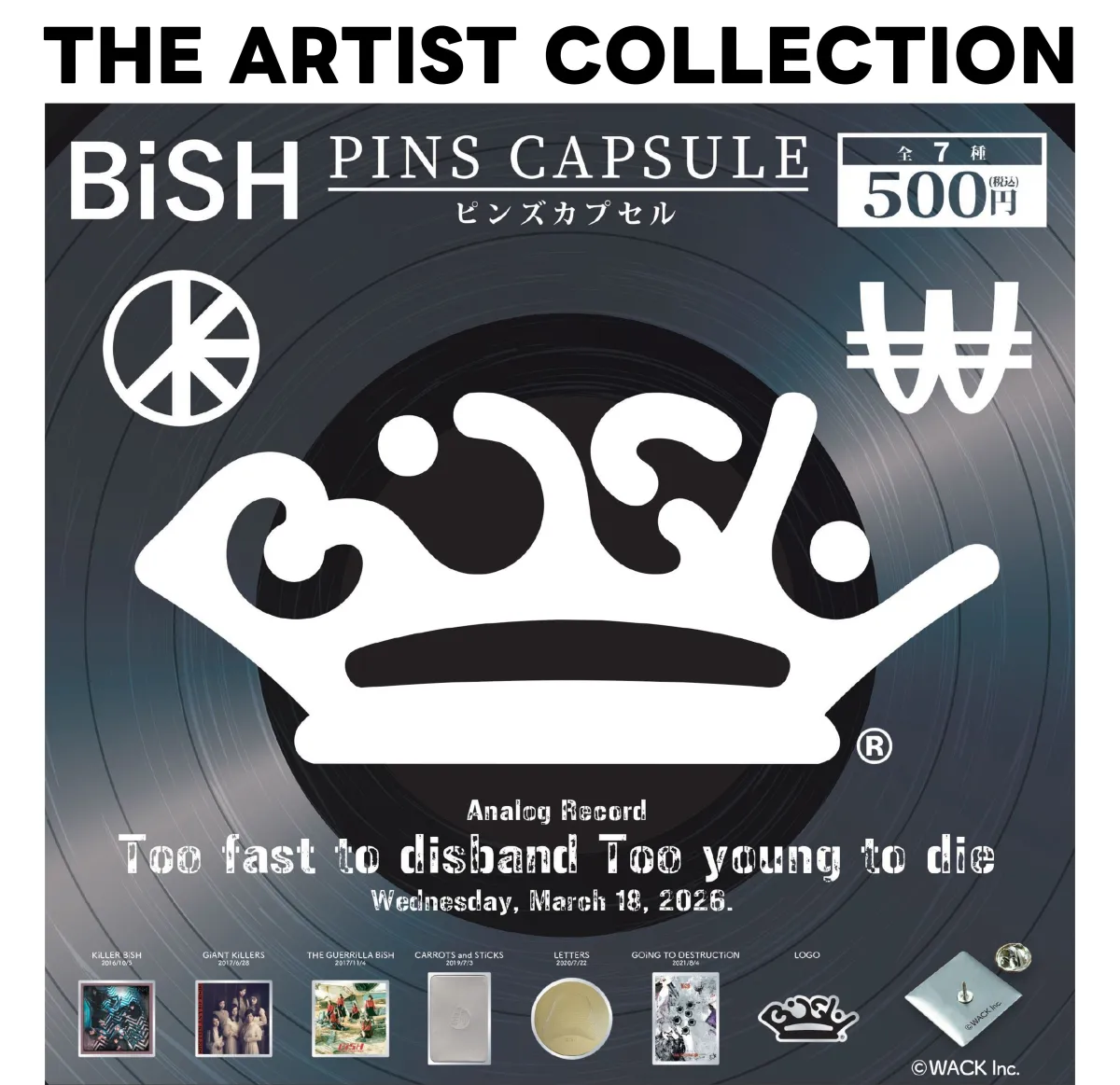 アーティストのアートワークやロゴをデザインした独特のカプセルトイシリーズ『THE ARTIST COLLECTION』の新作が話題です。そしてその最新作として、2023年6月に解散した伝説のガールズグループ、BiSHにフォーカスを当てたピンズカプセルトイが、1月30日(金)から販売を開始します!この企画は、2026年3月18日(水)に発売が予定されているBiSHの歴史を辿るアナログレコード『Too fast to disband Too young to die』のリリースを記念して行われるもので、ファンにはたまらない一品です。